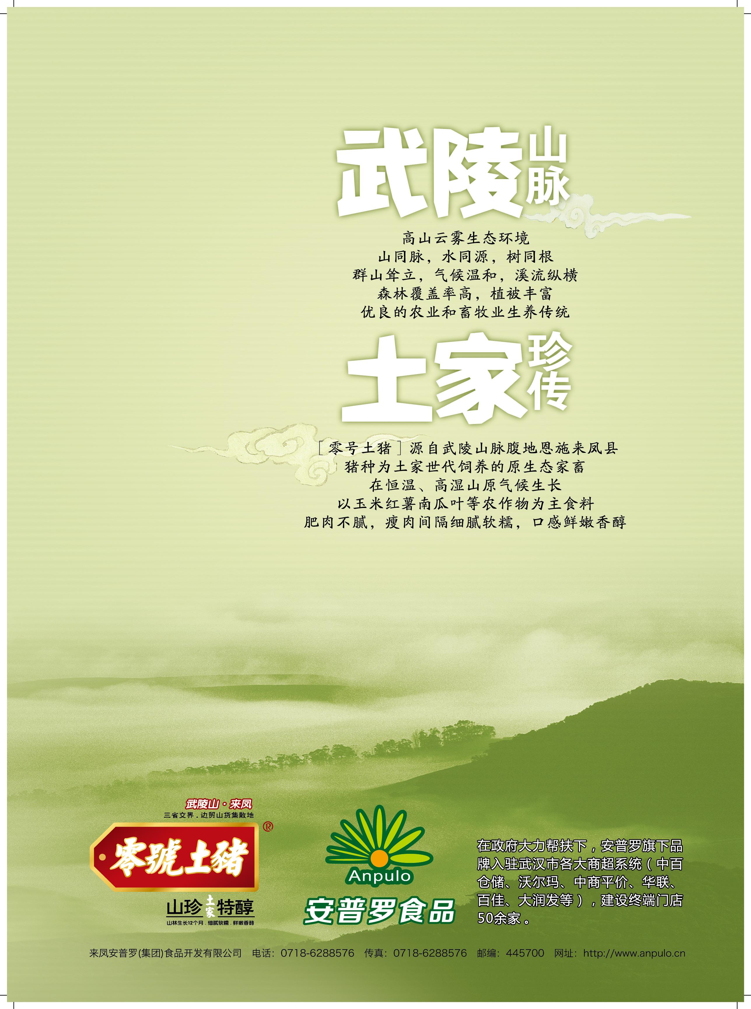 来凤安普罗(集团)食品开发有限公司成立于2005年,总部位于恩施来凤,注册资本4050万元,是一家专业生产加工销售武陵山土家族纯天然绿色食品的企业。员工近800名,年销售额逾3亿元。集团始终本着“诚信、务实、高效、拓新”的精神,“以特求存”的经营理念,以生产健康、绿色、时尚的土家食材为已任,逐步成为省、州农业产业化重点龙头企业,荣获“湖北省消费者满意单位”、“湖北省名牌产品”、“湖北省重合同守信用企业”、“恩施州知名商标”;荣获来凤县2010年度“优秀民营企业”“重点农业龙头企业”等荣誉称号。