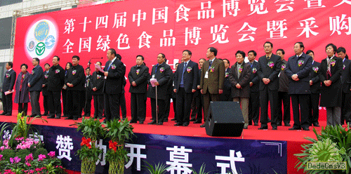 大会开幕式隆重热烈。中国商业联合会副会长姜明、副秘书长刘建沪、中国食品工业协会常务副会长韩家增、副秘书长杜荷、农业部绿色食品管理办公室副主任张华荣、全国城市农贸中心联合会会长马增俊;湖北省省长罗清泉、武汉市市委书记苗圩、武汉市市长李宪生、武汉市人大主任赵零、副主任刘善璧、苏忠遂、吴玉梅;市政协副主席杨付华、市委秘书长朱毅、市政府秘书长谭仁杰出席了开幕式。开幕式由武汉市市长助理万勇主持,湖北省副省长韩忠学致开幕词,中国食品工业协会常务副会长韩家增宣布大会开幕,贵州省副省长张群山及十多位副市长、副州长、副厅长参加了开幕式庆典活动。