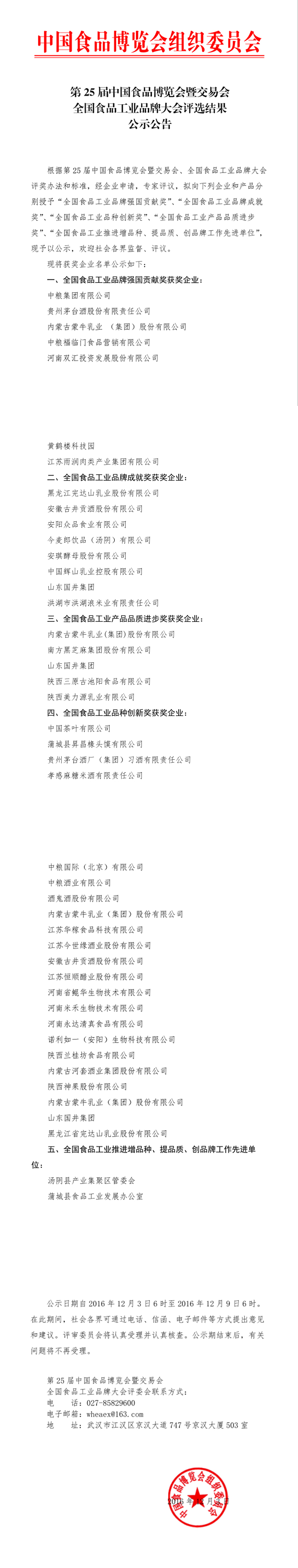 第25届中国食品博览会暨交易会全国食品工业品牌大会评选结果公示公告